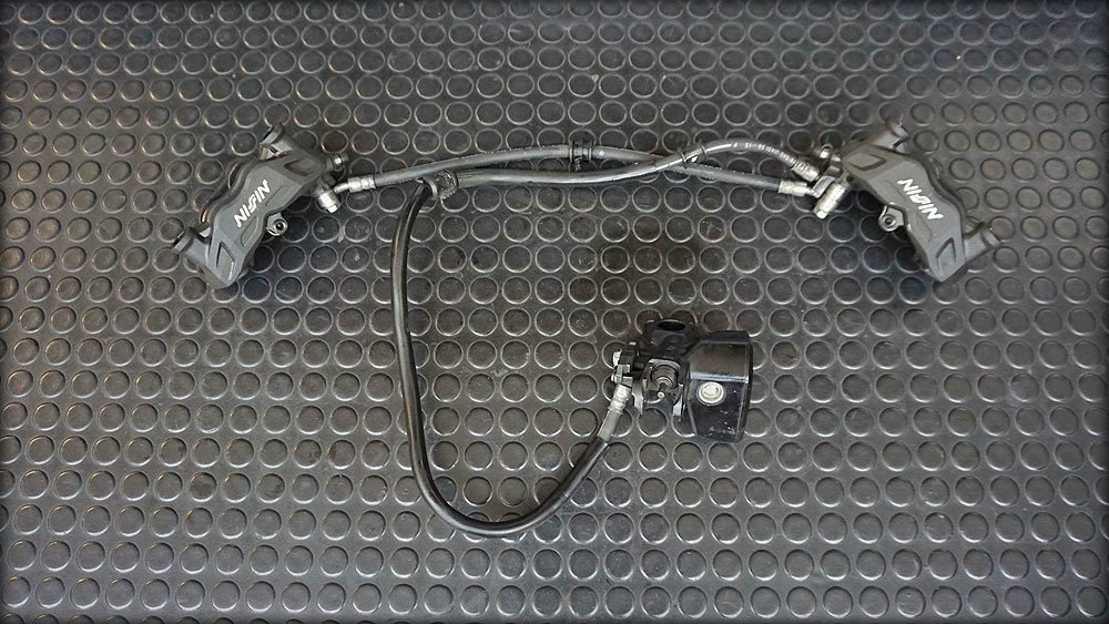 Suzuki B-King Bremse vorne mit Bremssättel schwarz mit guten Belägen, mit Bremsflüssigkeitsbehälter und Leitungen