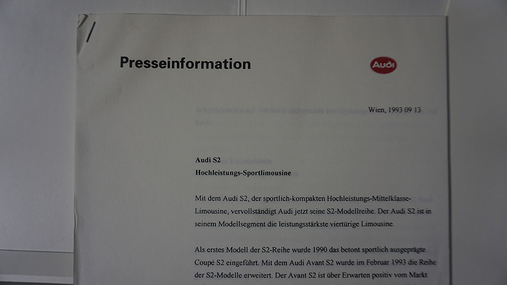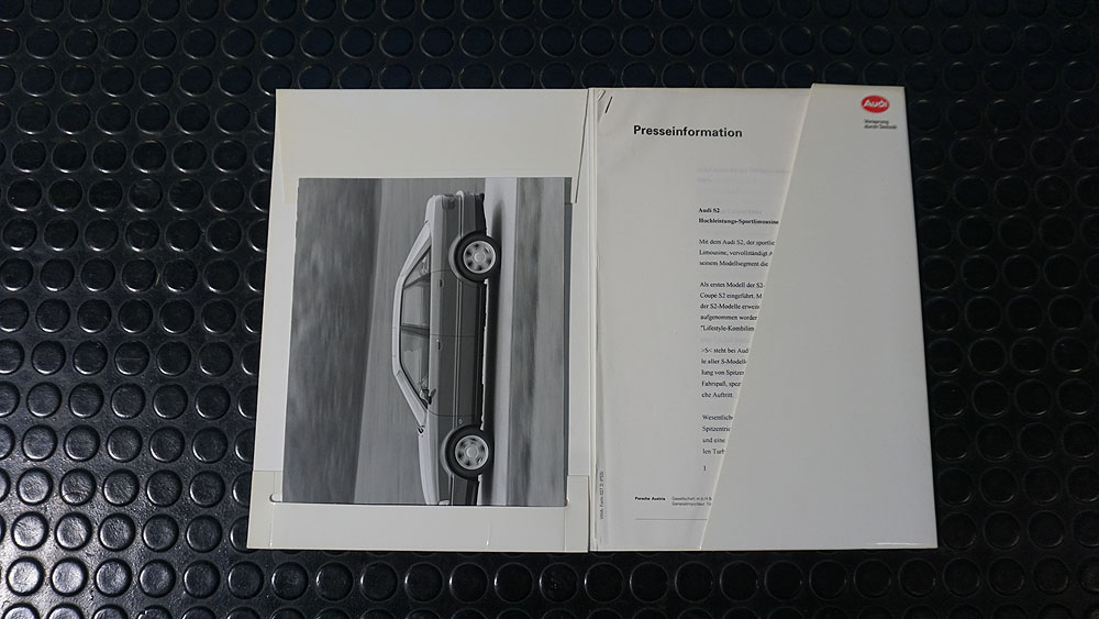 Pressemappe Audi S2 Limousine mit Pressefotos und Pressetext Deutsch, unverkäuflich