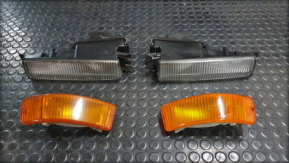 Audi Coupé Quattro 20V 7A Nebelscheinwerfer und Blinker. Halter Nebelscheinwerfer Fahrerseite repariert / geklebt, ansonsten alle Halter gut.