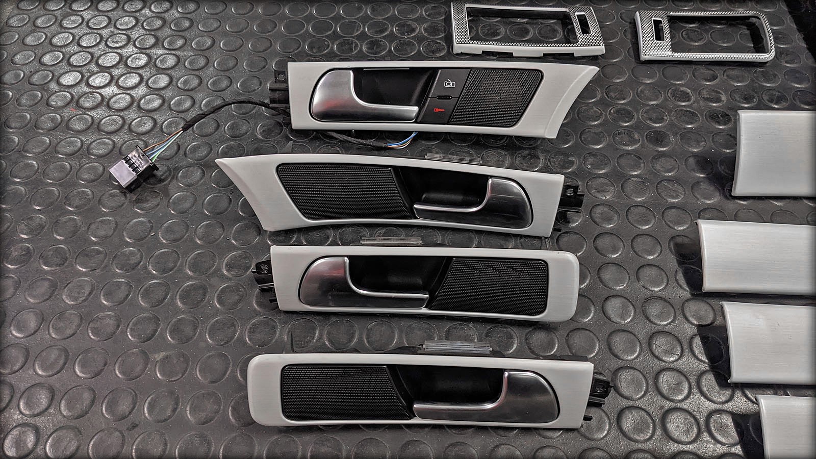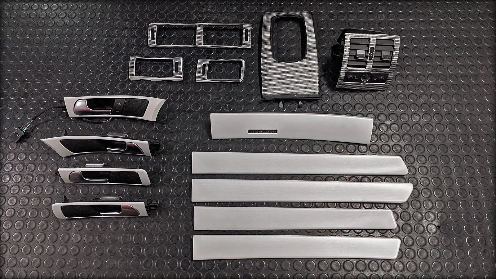 Audi RS6 V8 Biturbo Dekorleisten und Teile gemäss Umfang auf den Fotos. Dekorleisten sind "weiss gebürstet", inkl. Türgriffe rundum und Abdeckungen Lüftungsgitter / Schaltkonsolenumrahmung mit Dekor versehen.