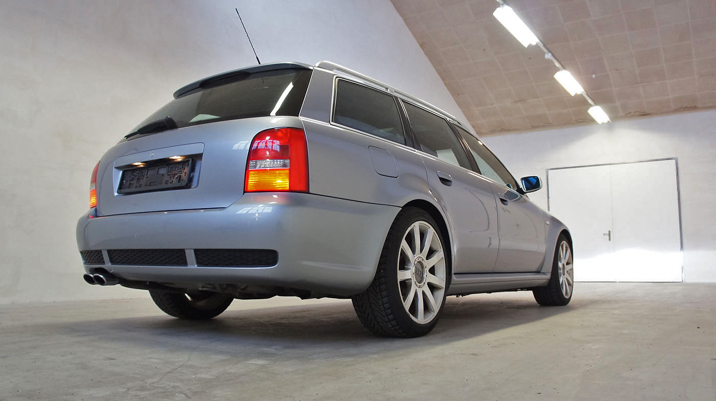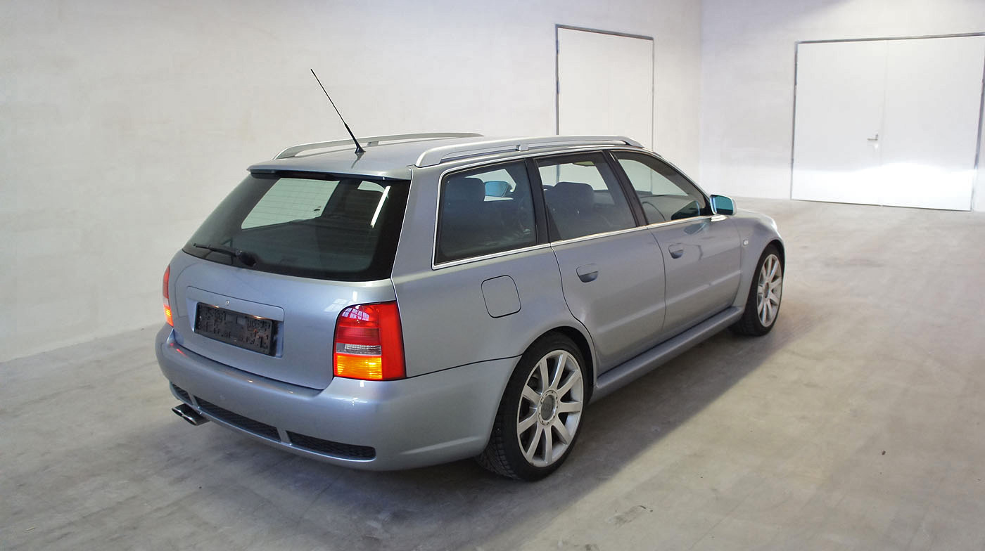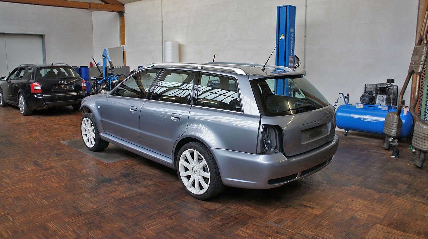 Audi RS4 B5 Biturbo, grosse RS4 B7 Bremse mit Gutachten, Recaro Lederausstattung schwarz, Carbon Decorleisten, Glas-Schiebedach, Vorkats entfernt und Individualabstimmung durch RS-Werkstatt ca. 440, Tempomat, stärkere Benzinpumpe, Sportec Schaltwegverkürzung.