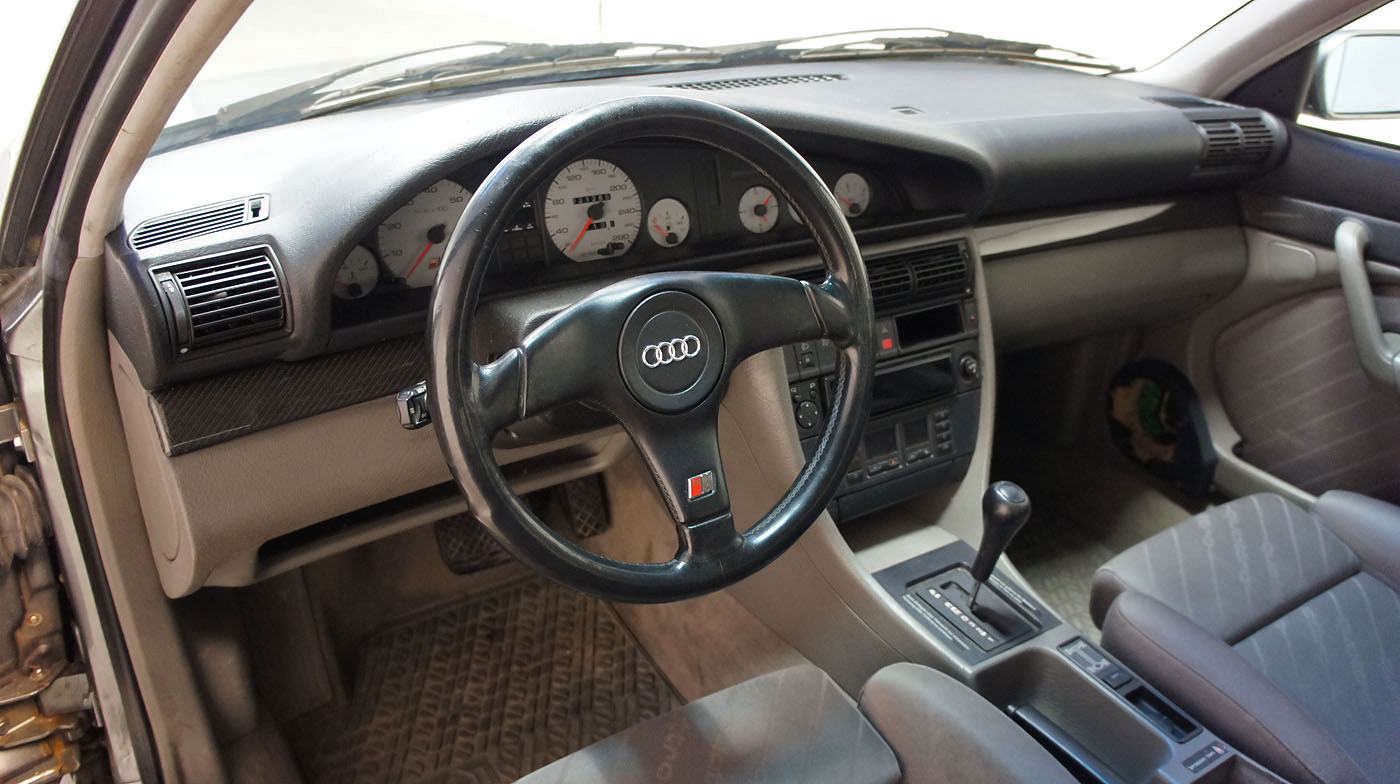 Audi S4 C4 20V Turbo AAN mit Automat, Jahrgang 1992, 3 Speichen Sportlenkrad ohne Airbag, Carbon Decorleisten Version ohne Beifahrerairbag, UFO, Boleros in gutem Zustand, abnehmbare Anhängerkupplung, Heckklappe mit Dellen und etwas Rost, Heckleuchtenband mit Riss, Kotflügel rechts ganz leichte Delle, Blinker links vorne Risse, Motor startet nicht mit Vermutung auf defekte Benzinpumpe.