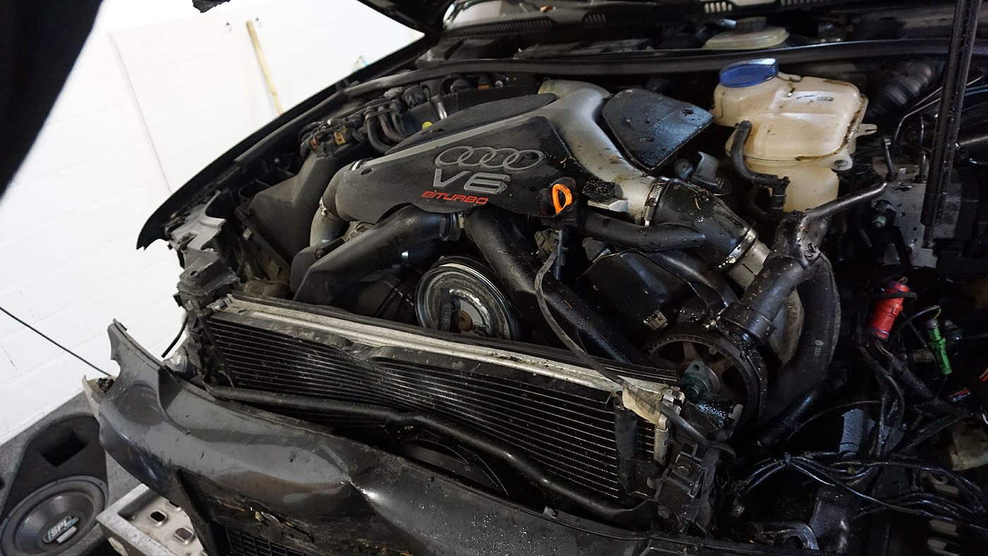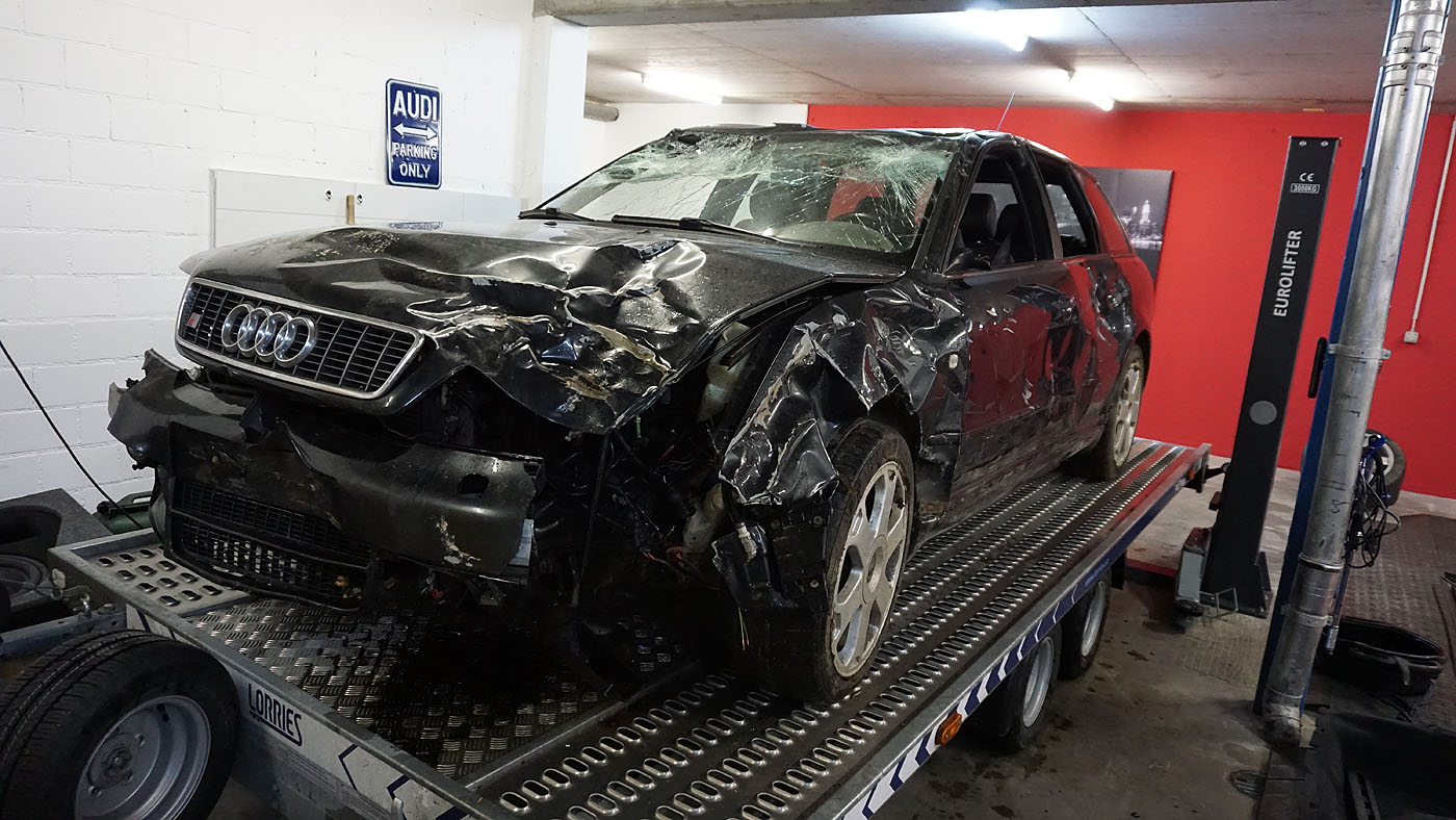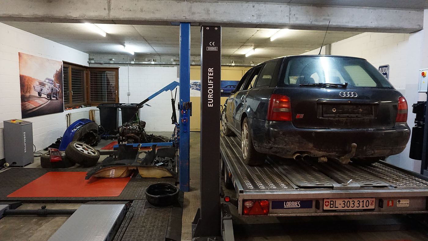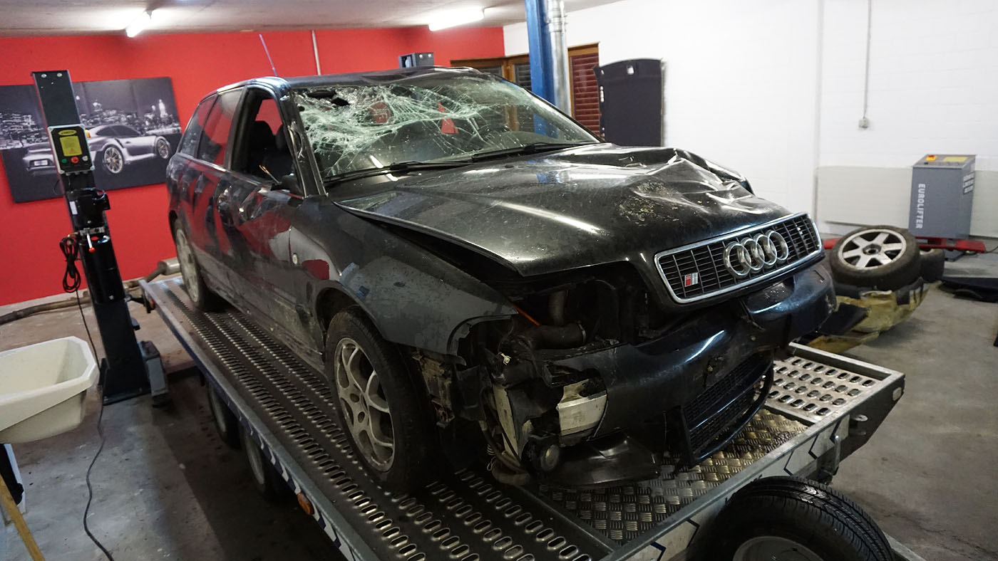 Neuzugang Audi S4 Biturbo B5 Avant: Motor AGB Vorfaclift, Lederausstattung, Heckstossstange mit Parksensoren. Motor lief noch, Zahnriemen drauf, div. Plastikteile defekt (Ansaug-/Druckrohre) linke Seite.