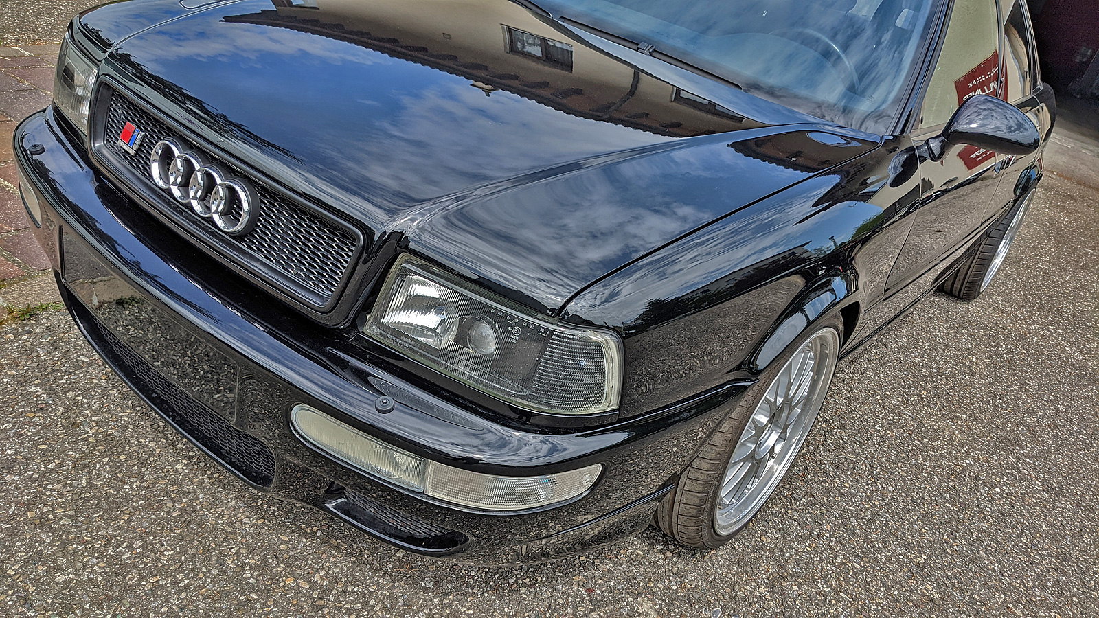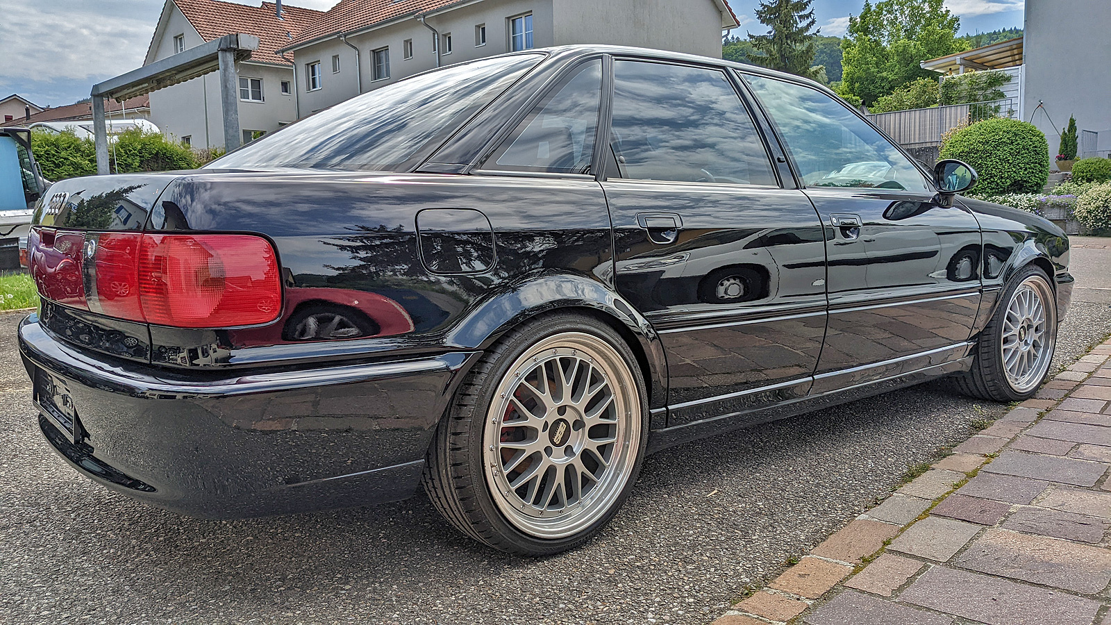 Audi S2 Limo, umfassend umgebaut: RS2 Stange vorne und hinten, Hecklbende RS2, RS2 Heckklappengriff, RS2 Kühlergrill, RS2 Scheinwerferleisten, RS2 Embleme, RS2 Spaltabdeckungen, RS2 Aussenspiegel, RS2 Unterbodenschutz, Porsche Bremse, RS2 Recarositze, RS2 Lenkrad, RS2 Tacho, RS2 Zusatzinstrumente, RS2 Innentürgriffe schwarz, RS2 Angstgriffe schwarz und RS2 Make-Ups, Dachhimmel Alcantara dunkel bezogen, RS2 A-Säulenverkleidungen. RS2 Motor mit, Motorsport Turbolader KKK 26/27/29, GT2 Einspritzdüsen, einstellbarer Benzindruckregler, RS2 Ladeluftkühler, RS2 Luftfilterkasten, RS2 Abgasrohr, RS2 Katalysatoren, Edelstahl Abgasanlage, KW Gewindefahrwerk, BBS Le Mans Felgen Originalware, RS2 Motorsteuergerät mit PKM Optimierung auf Hardwareänderungen, Ladedruckanzeige Spezialanfertigung in Durchlichttechnik in RS2 Optik,