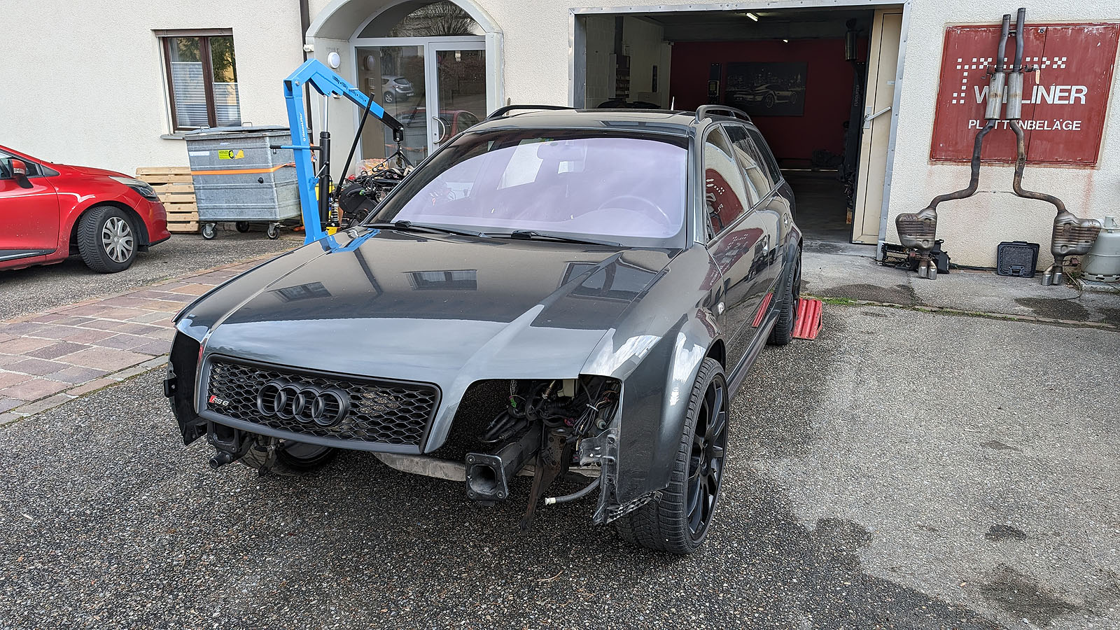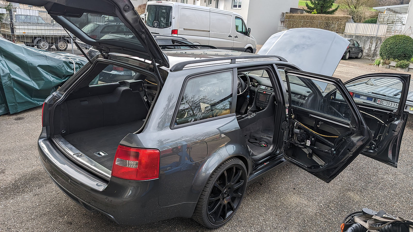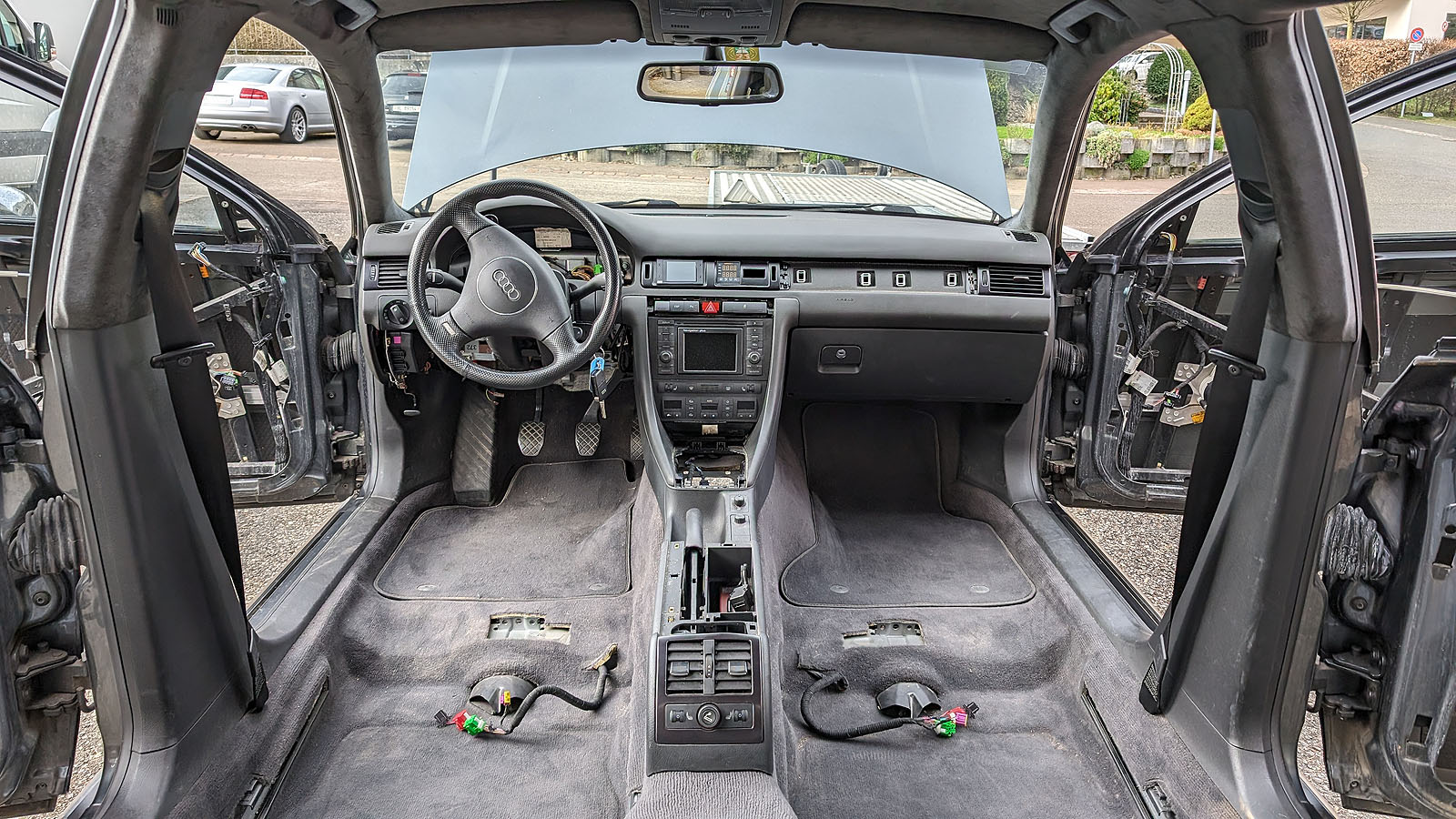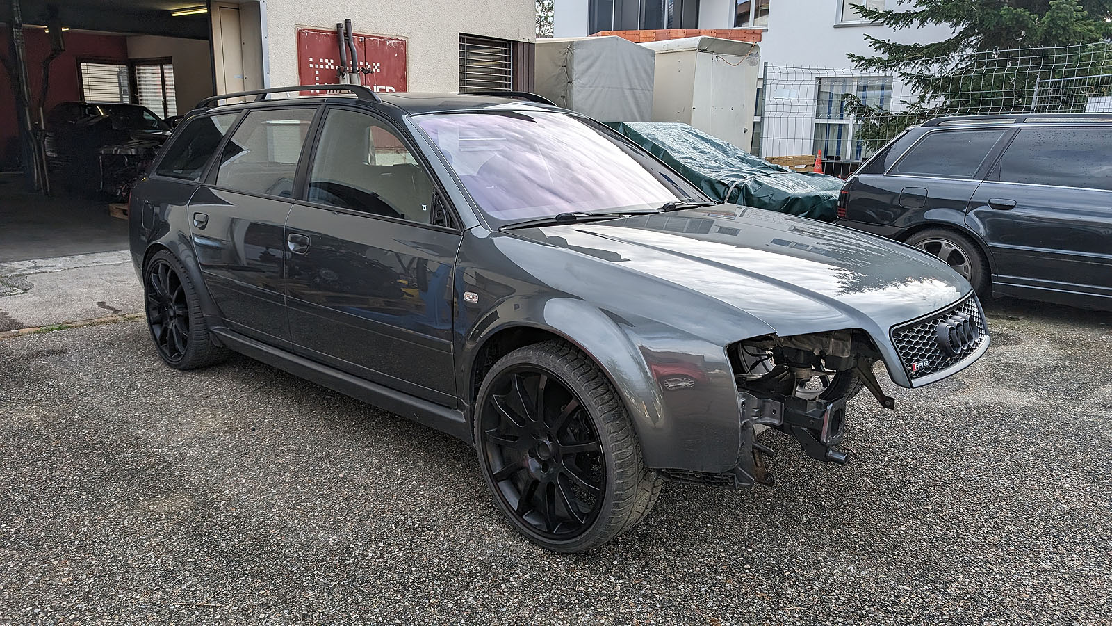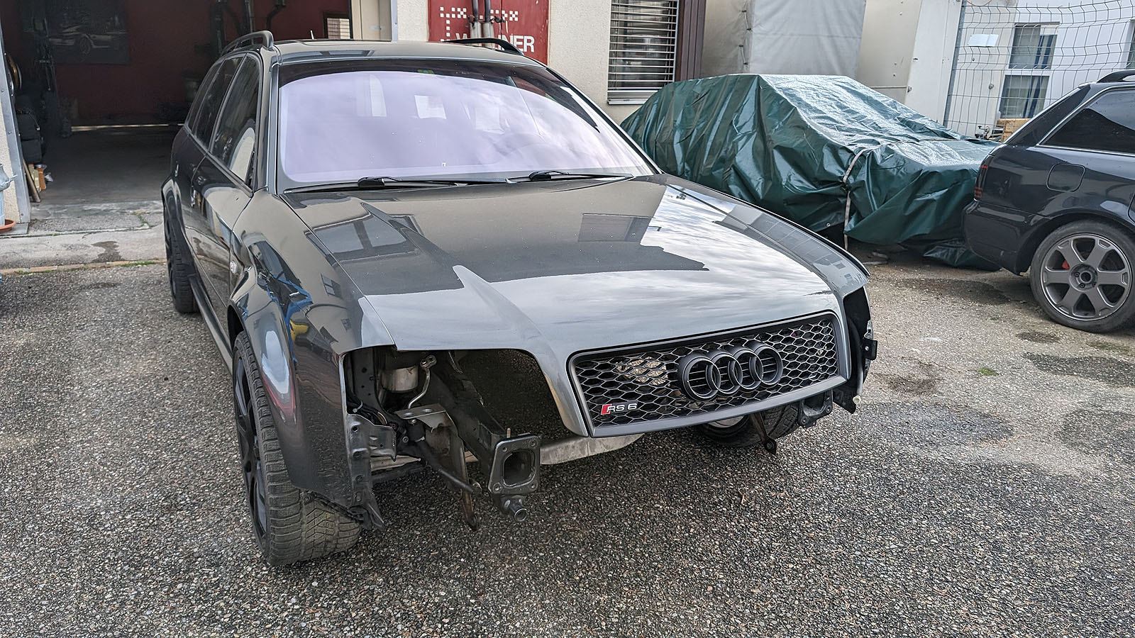 Audi RS6 C5 V8 Buturbo teilzerlegt. Es fehlen Motor mit Getriebe, Antriebswellen und Kardanwelle, Aussenspiegel, Frontstange, Scheinwerfer, Maske mit Kühlern, Motorsteuergerät, Dekorleisten Innenraum, Sitze und Türverkleidungen, Mittelkonsole mit MAL, Tacho, Bremssättel mit Scheiben/Belägen/Blechen, Hosenrohre/Kats mit Auspuffanlage.