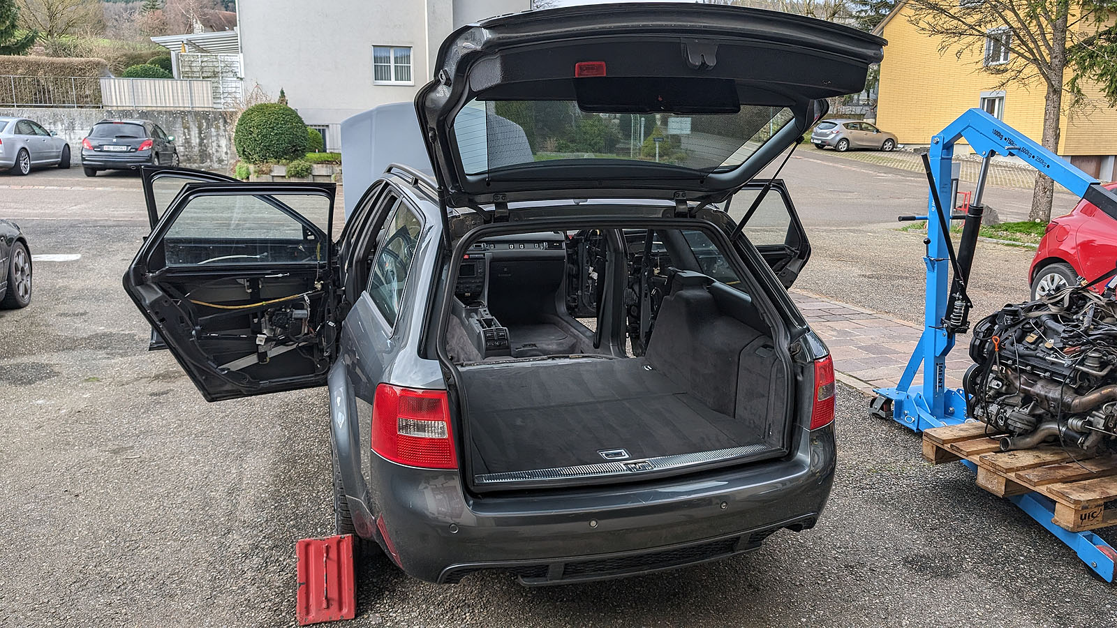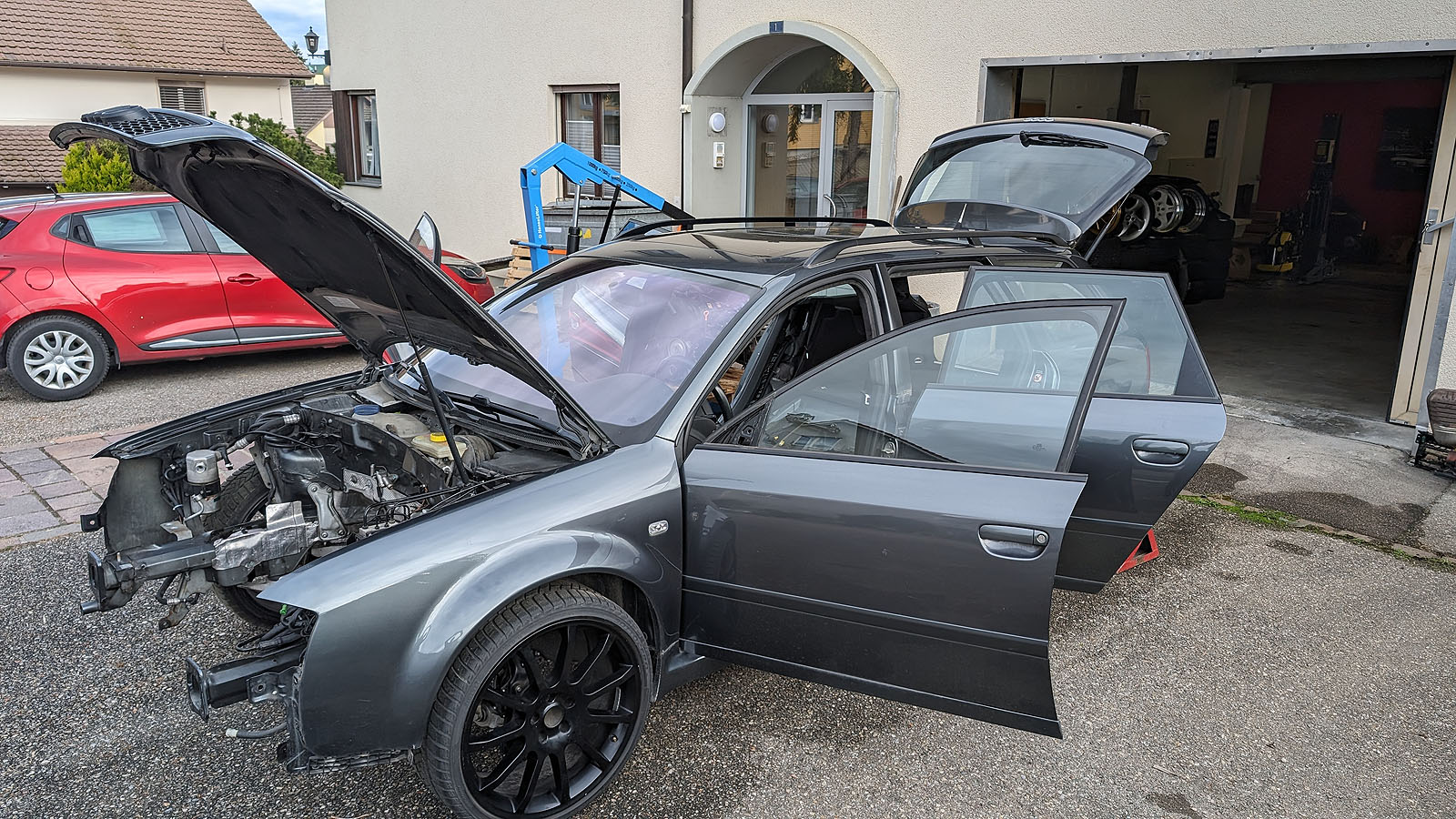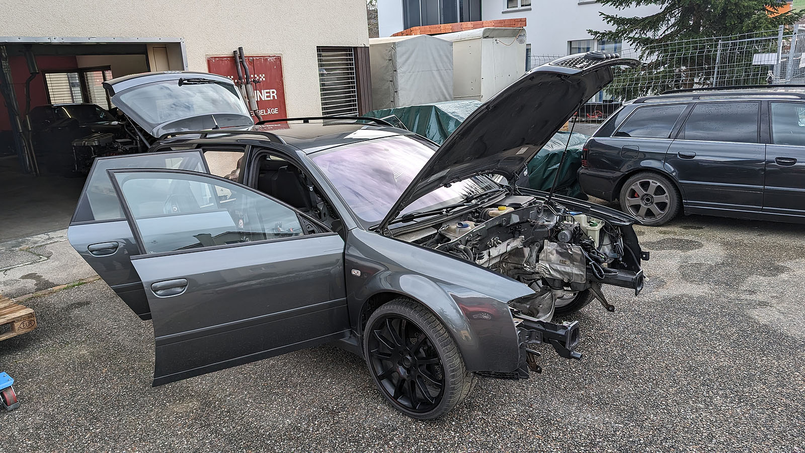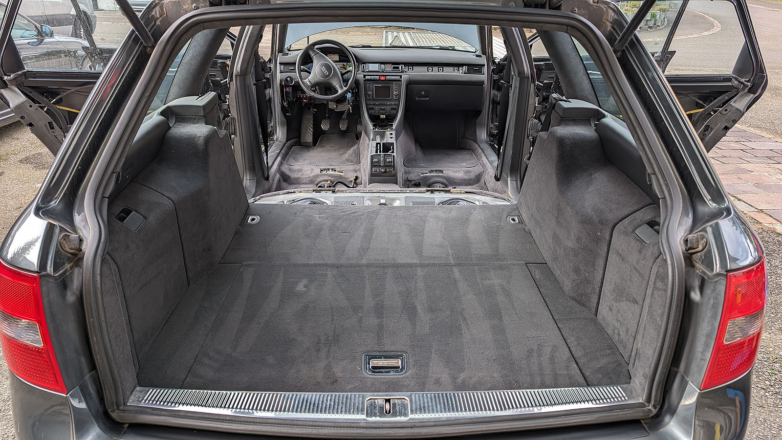 Audi RS6 C5 V8 Buturbo teilzerlegt. Es fehlen Motor mit Getriebe, Antriebswellen und Kardanwelle, Aussenspiegel, Frontstange, Scheinwerfer, Maske mit Kühlern, Motorsteuergerät, Dekorleisten Innenraum, Sitze und Türverkleidungen, Mittelkonsole mit MAL, Tacho, Bremssättel mit Scheiben/Belägen/Blechen, Hosenrohre/Kats mit Auspuffanlage.