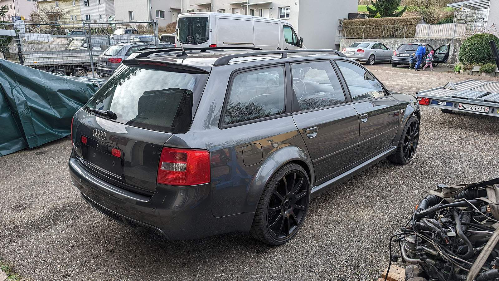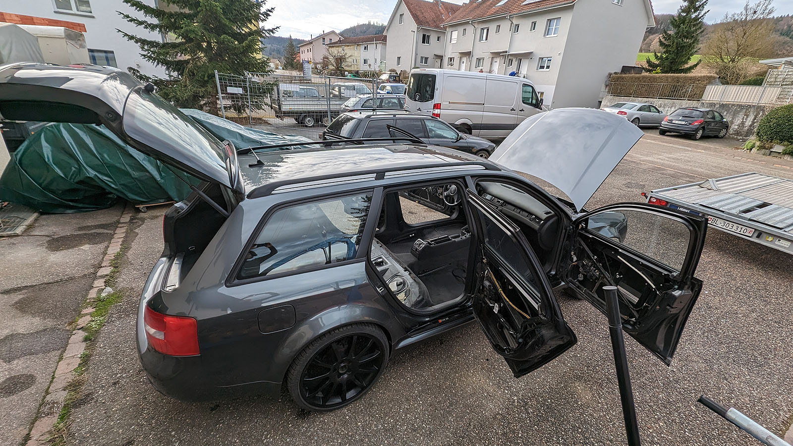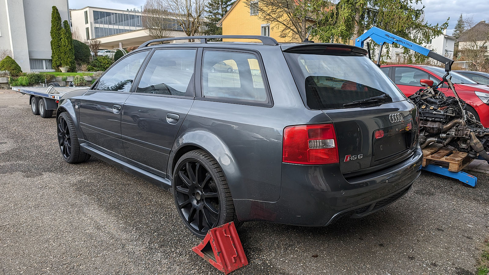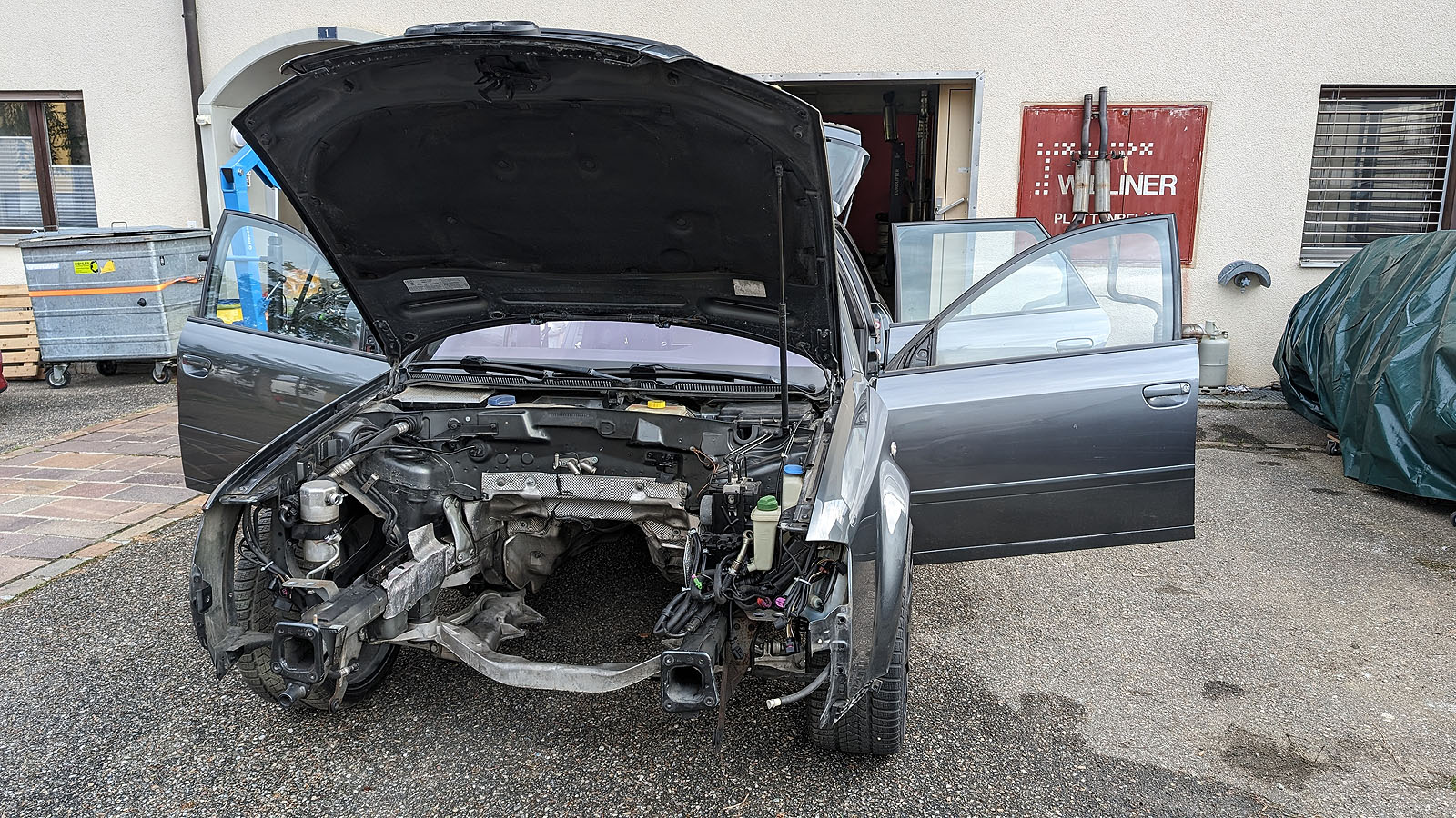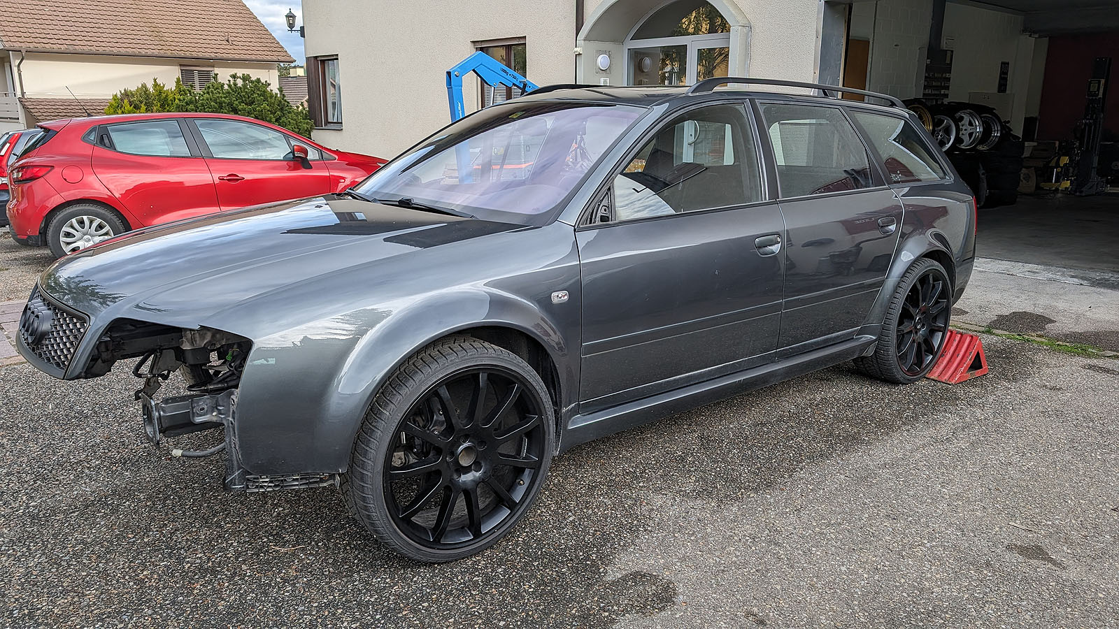 Audi RS6 C5 V8 Buturbo teilzerlegt. Es fehlen Motor mit Getriebe, Antriebswellen und Kardanwelle, Aussenspiegel, Frontstange, Scheinwerfer, Maske mit Kühlern, Motorsteuergerät, Dekorleisten Innenraum, Sitze und Türverkleidungen, Mittelkonsole mit MAL, Tacho, Bremssättel mit Scheiben/Belägen/Blechen, Hosenrohre/Kats mit Auspuffanlage.