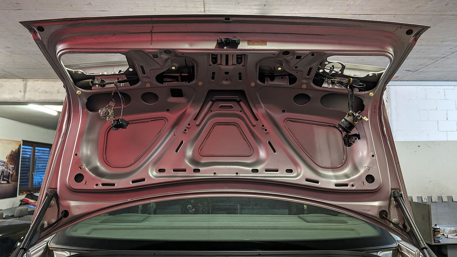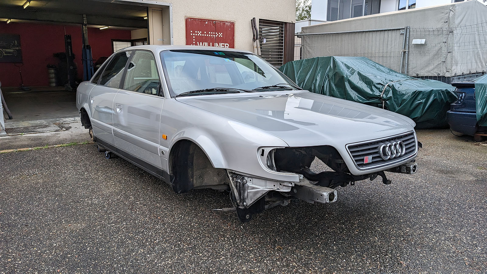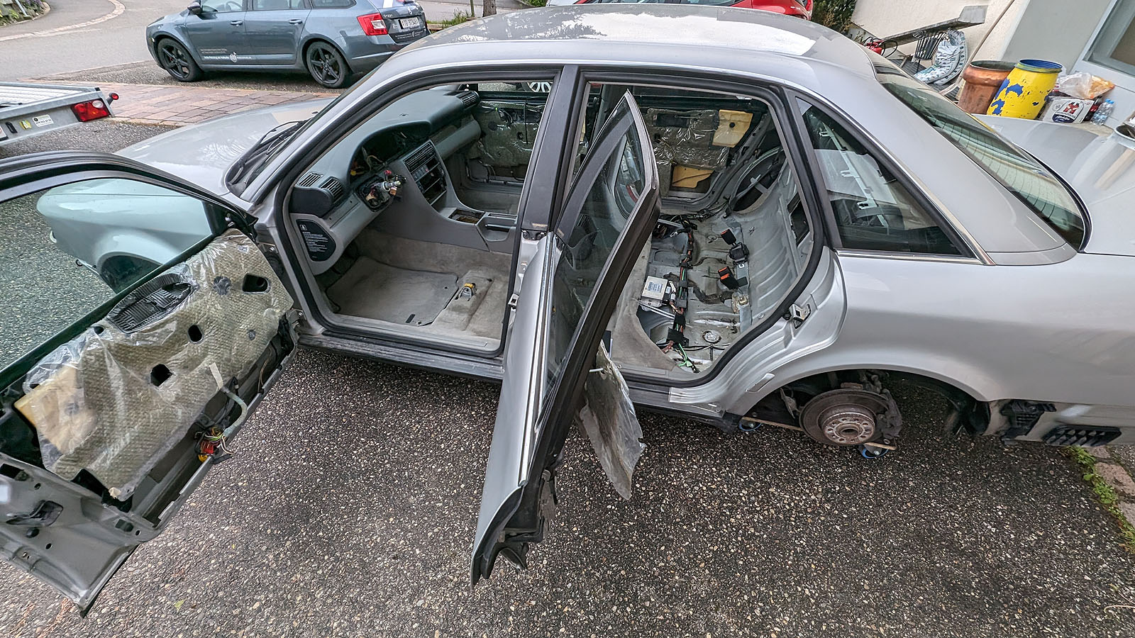 Alle Kabelbäume im Fahrzeug original verlegt. Dachhimmel mit allen Anbauteilen (Himmel muss neu bezogen werden). Radhauschalen rundum montiert, Benzintank komplett montiert inkl. Benzinpumpe und Benzinleitungen bis in den Motorraum.