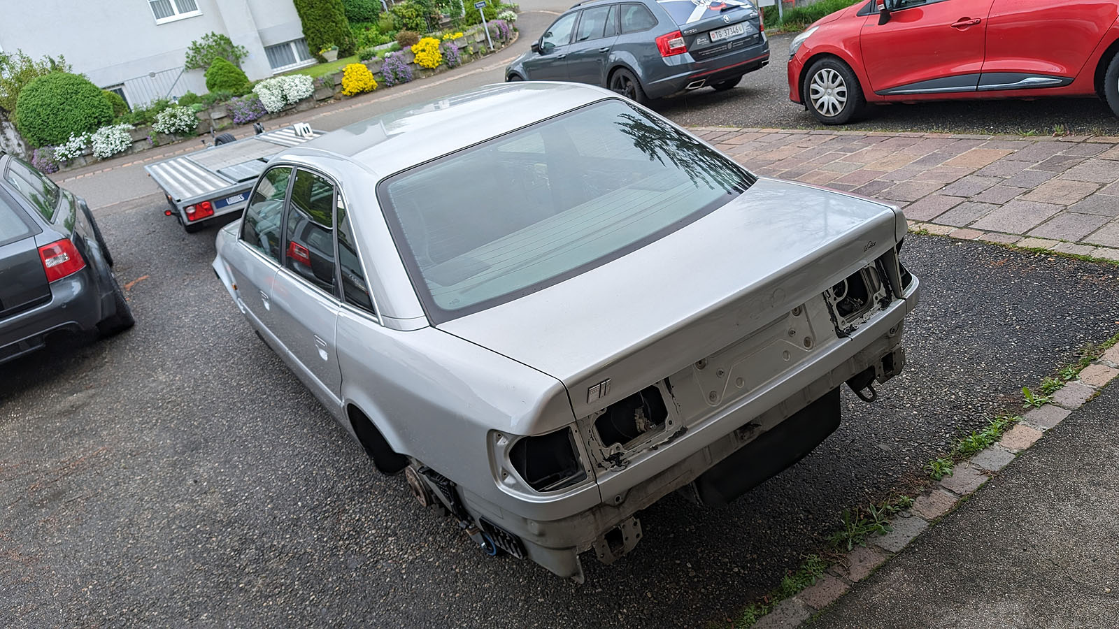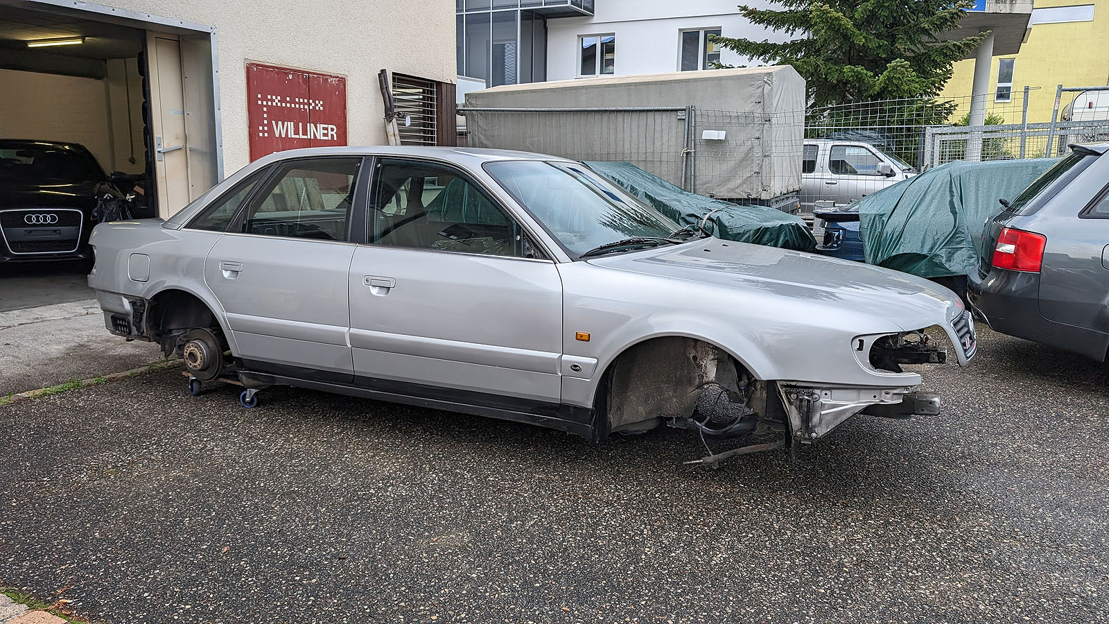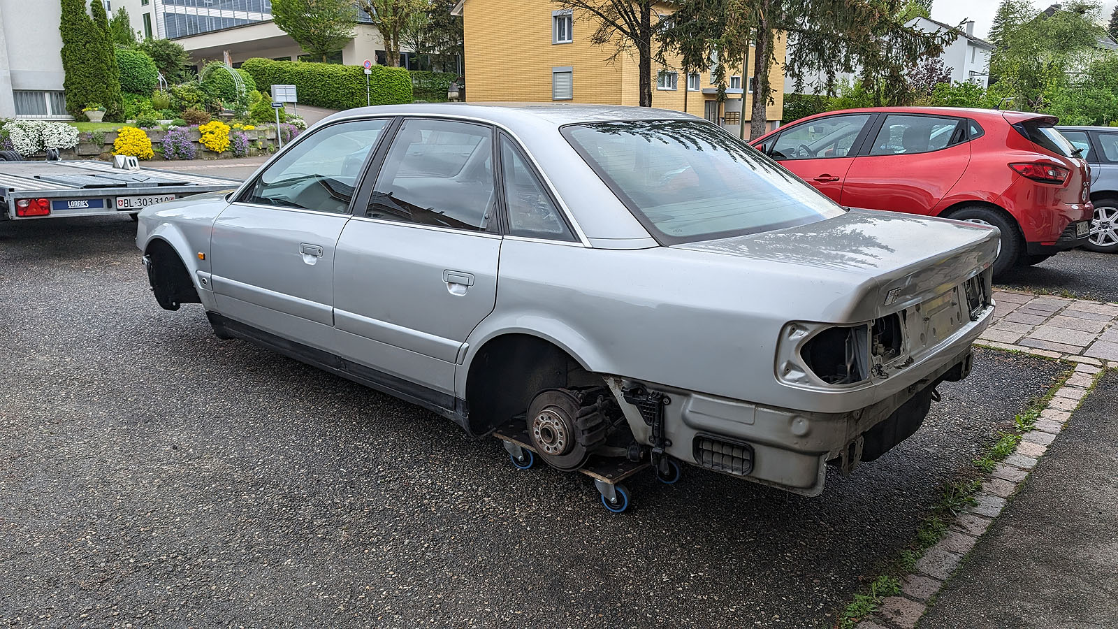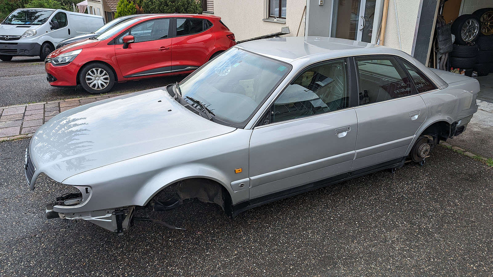 Karosse mit abgebildeten Blechteilen, Achsen, Achse hinten komplett mit Differential, Antriebswellen, Achsschenkeln Radnaben, Bremse.