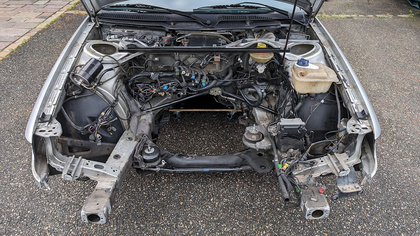 Bremskraftverstärker mit Hauptbremszylinder und Leitungen bis an die Bremssättel (vorne ohne Bremsschläuche) montiert.
