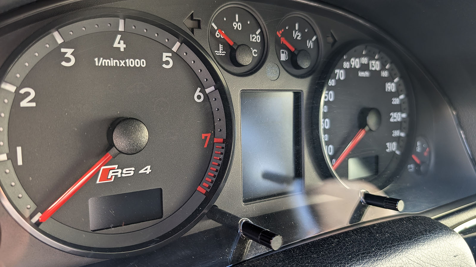 Der Innenraum ist gepflegt, das Lenkrad hat am Kranz Gebrauchsspuren. Das Tacho-Display ist ohne Pixelfehler.
