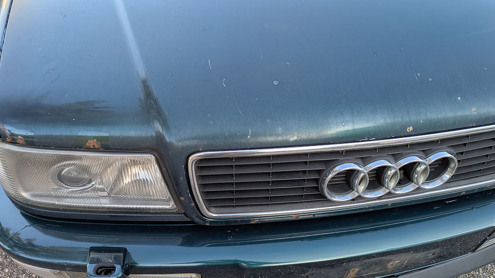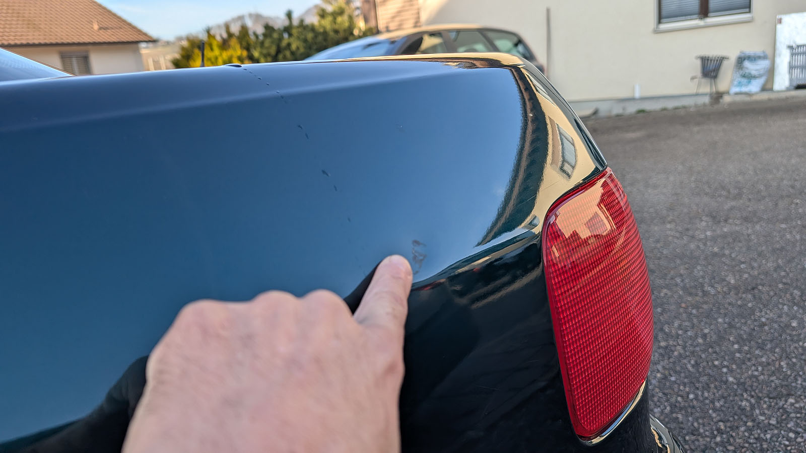 Optik schlecht: Div. Steinschläge vorne die etwas rostig sind. Kleinere mehrere Roststellen an den üblichen Sachen, nichts wildes. Viele klein Parkdellen von andere Autotüren / Parken. Die Limo muss neu lackiert werden, Lack schlecht, grossflächig abgeschossen durch Striemen von alten Waschanlagenbürsten.