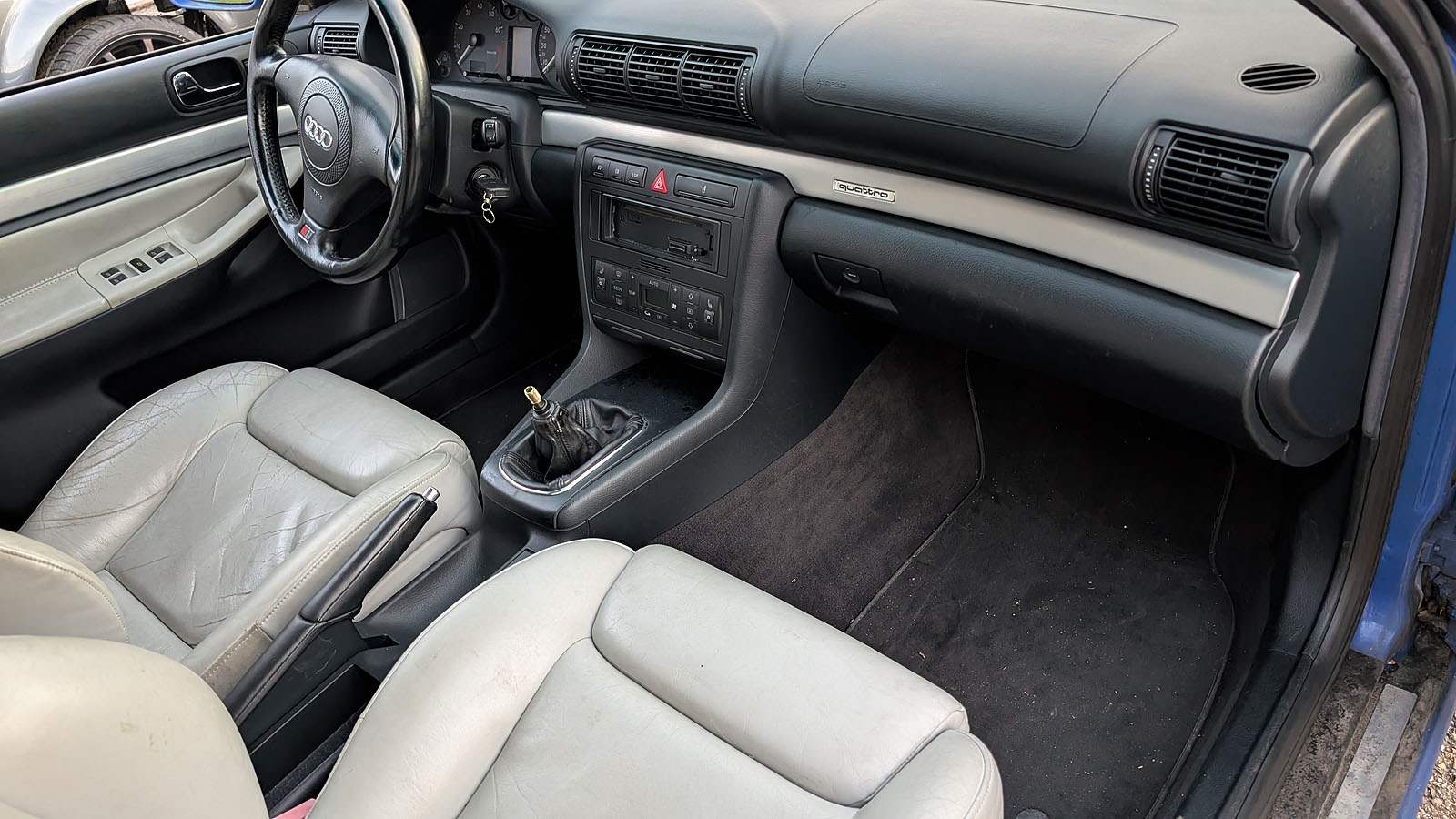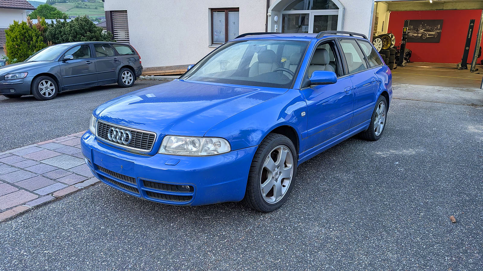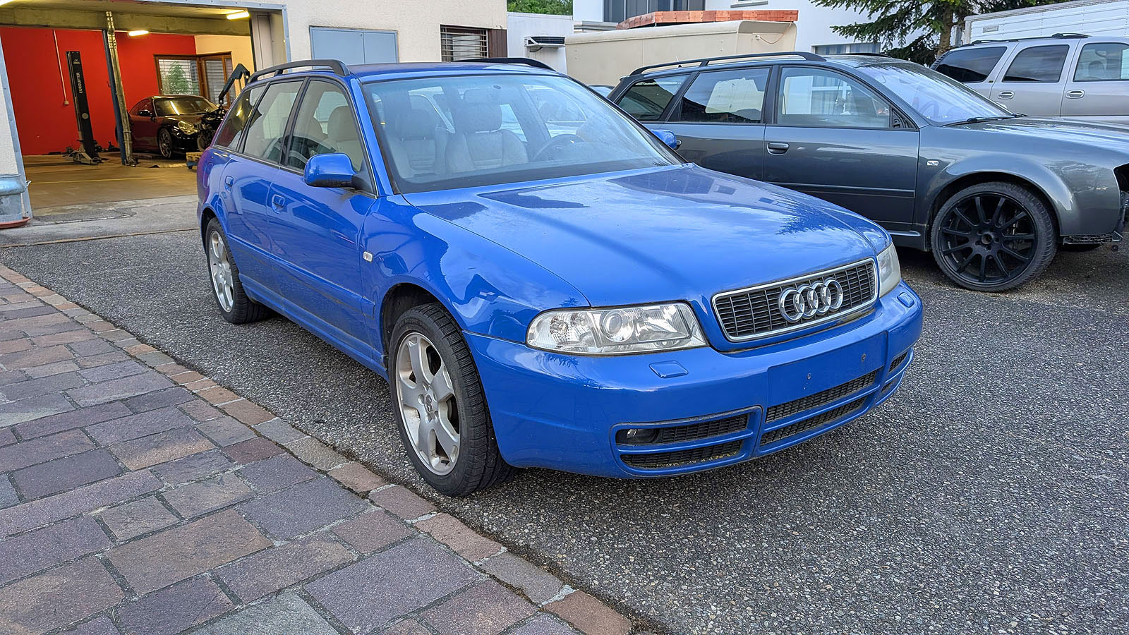 Audi S4 B5 Avant Facelift, Jg. 2000, Motor AGB, ohne Schiebedach, Getriebe wurde ausgebaut und fehlt, Recaro Lederausstattung weiss in gutem Zustand (darf gereinigt werden), Kats Flexrohre zu ersetzen, Dachhimmel hängt, Anhängerkupplung Werksausführung (Haken fehlt), Bremssättel vorne neuwertig, stand 2-3 Jahre im Freien, daher etwas "angemost", Motor läuft gut, Serviceheft 220 tkm.