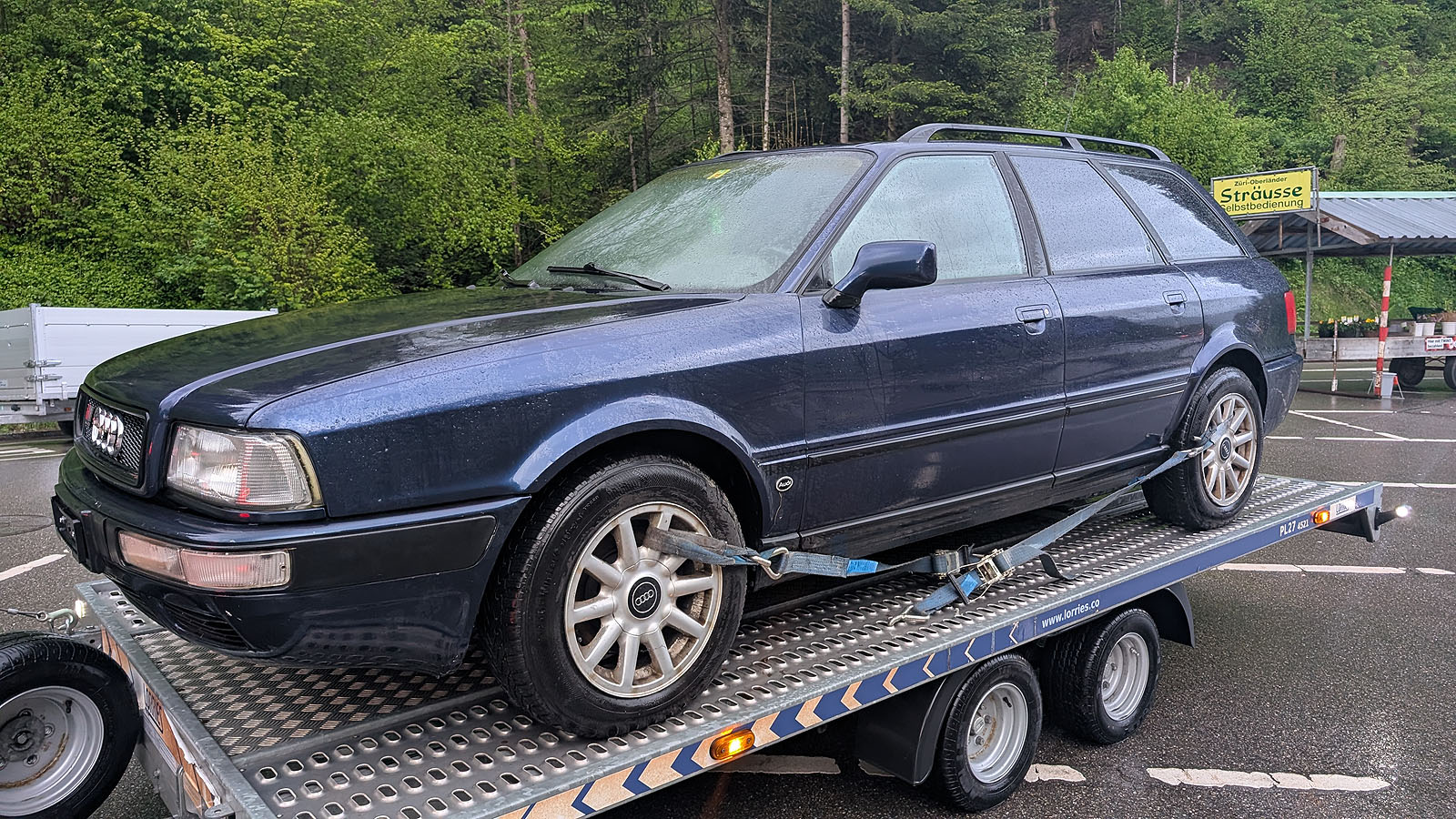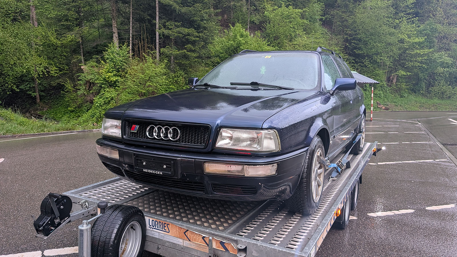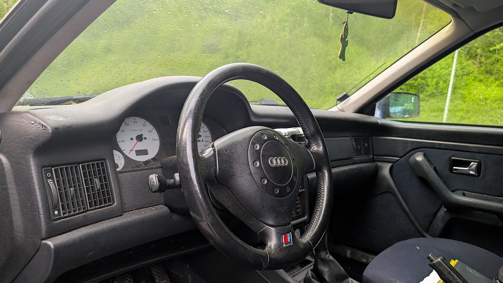 Audi 80 Avant V6 2.6l Quattro, RS2 Heckstossstange (Nachbau), RS2 Heckblende, RS2 Lenkrad, RS2 Kühlergrill, RS2 Tacho (nicht Gehäuse), RS2 Zusatzinstrumente, Modell 1995 mit Beifahrerairbag Lochleder-Dekorleisten, dicke Lenksäule.
