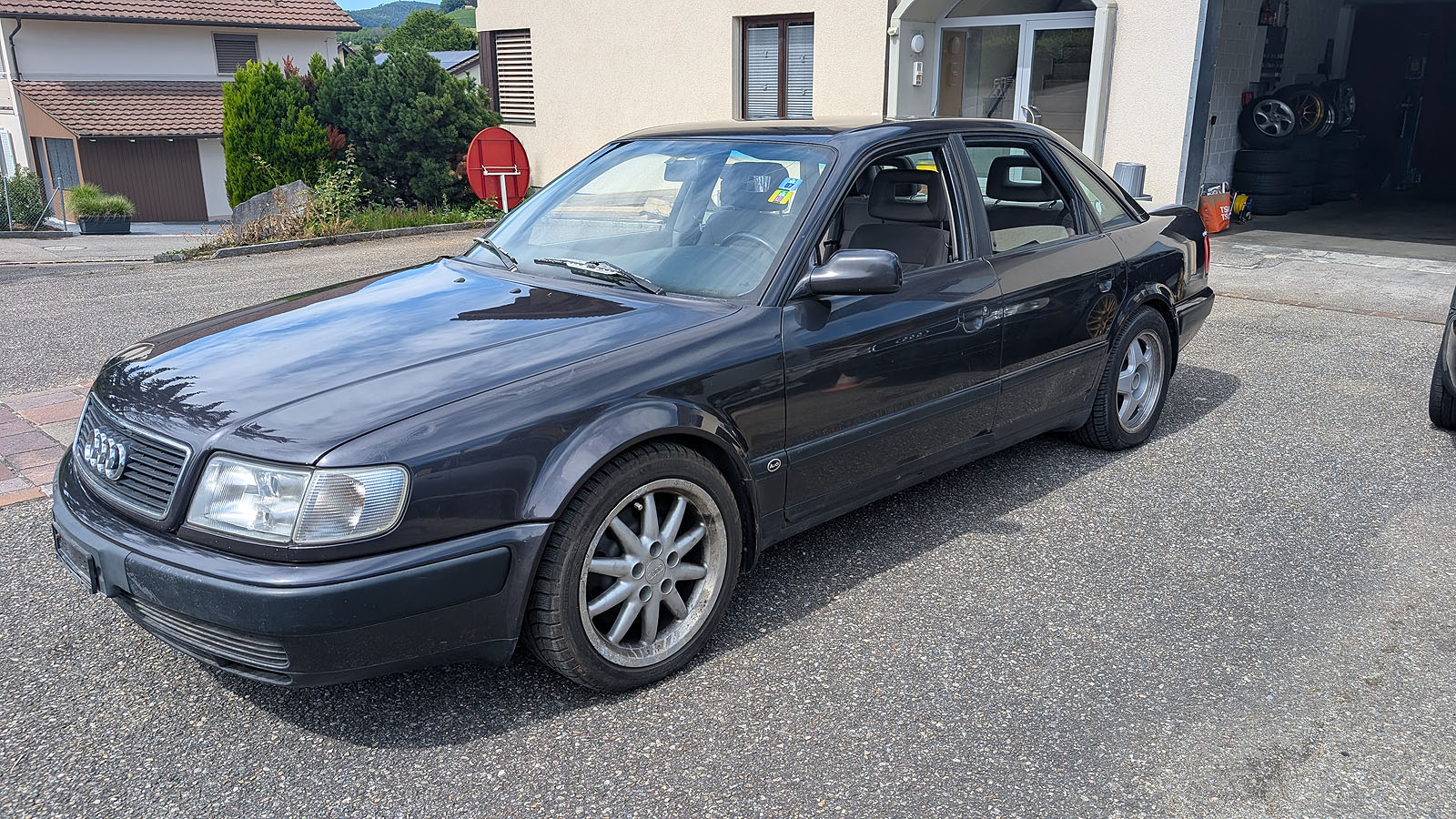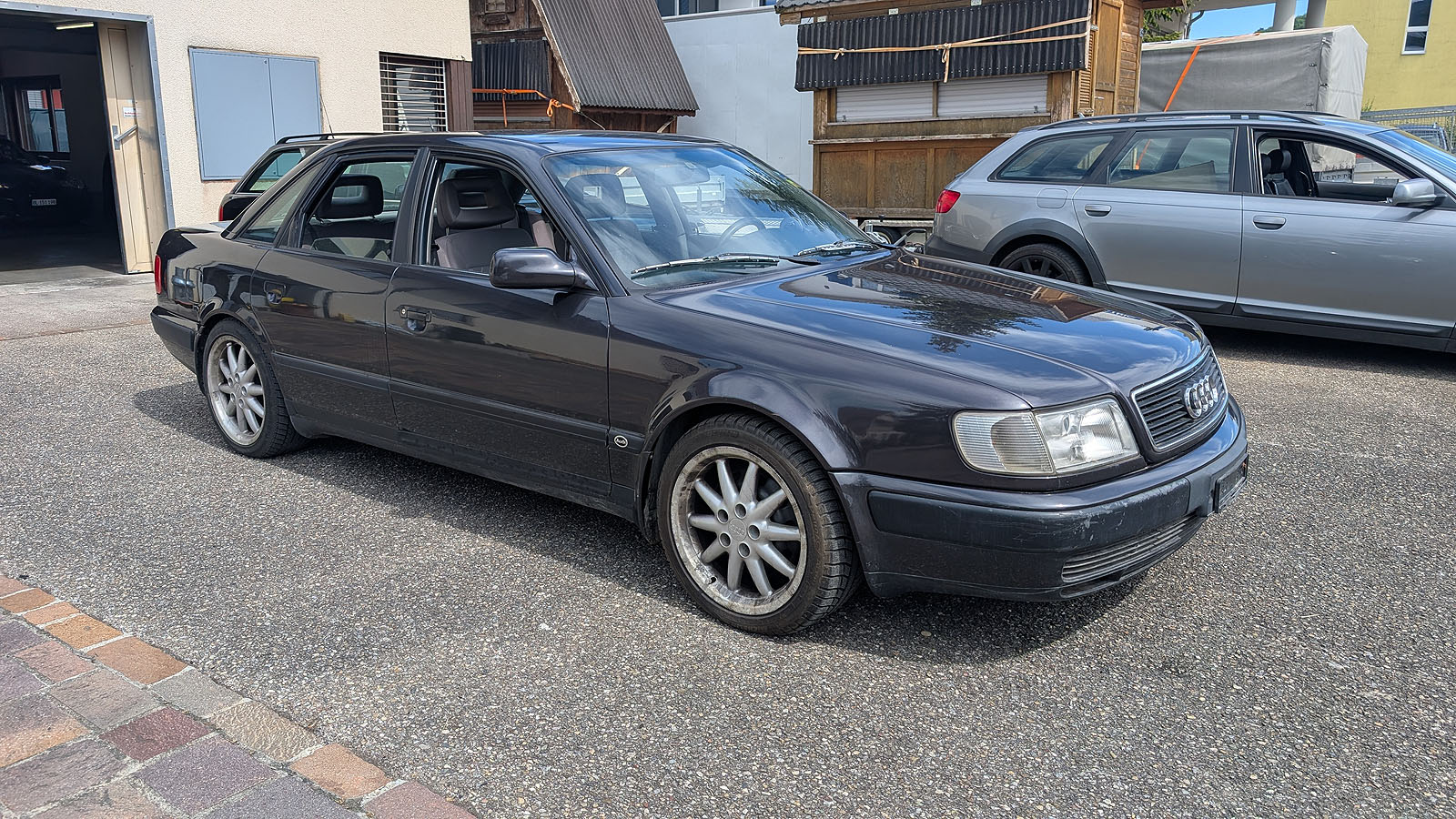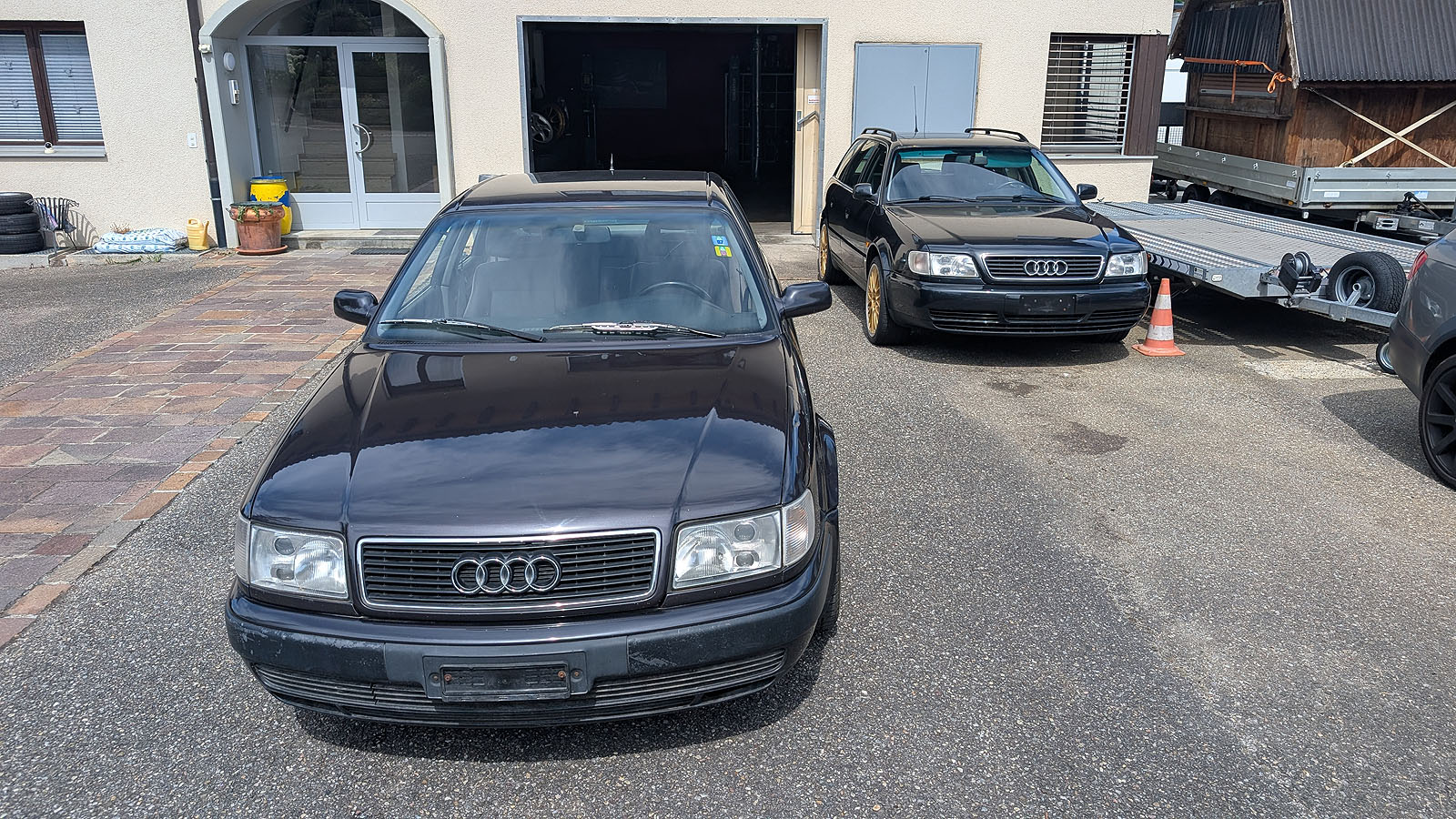 Audi S4 C4 AAN 20V Turbo Handschalter, Jg. 1992 mit UFO Bremse, Jaquard Satin Sitze hell, Wurzelholz Dekorleisten, 3 Speichen Sportlenkrad ohne Airbag. Motor Getriebe einwandfrei, Karosse mit klaren Gebrauchsspuren, Frontscheibe gerissen, Zierleisten rundum alle defekt, hinten links prov. reparierter Unfall auf der Karosse rostig, keine S4 Heckblende, Bremserei hinten und Fahrwerk defekt, Achsteile rostig. Stossstangen Gebrauchsspuren aber gut, Scheinwerfer gut, Sitze gut ohne Risse/Löcher