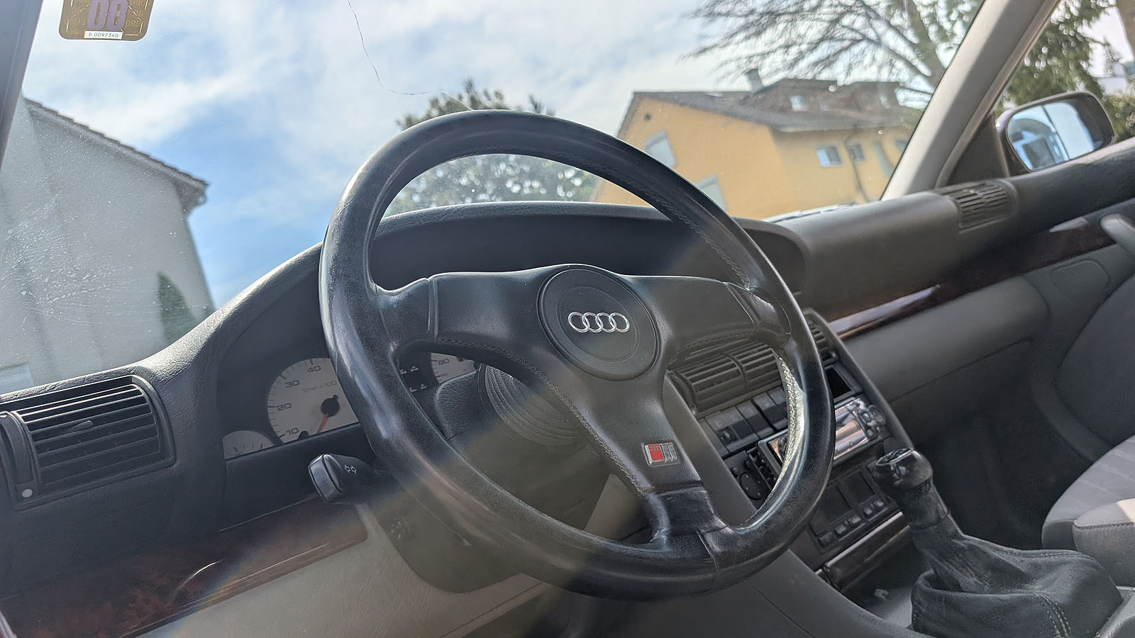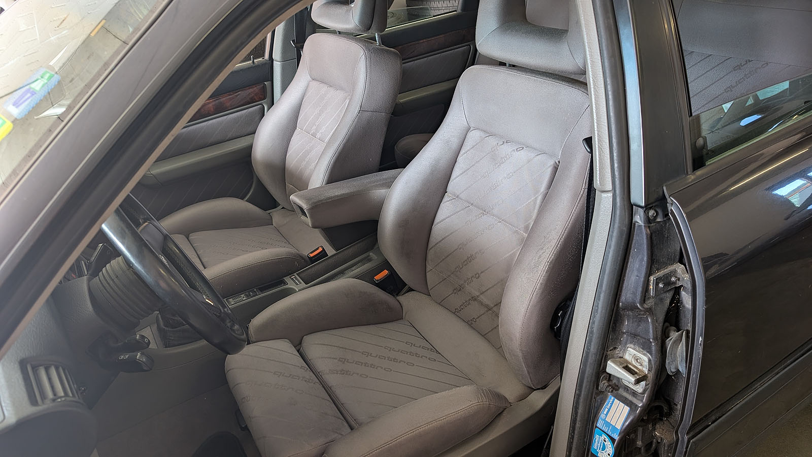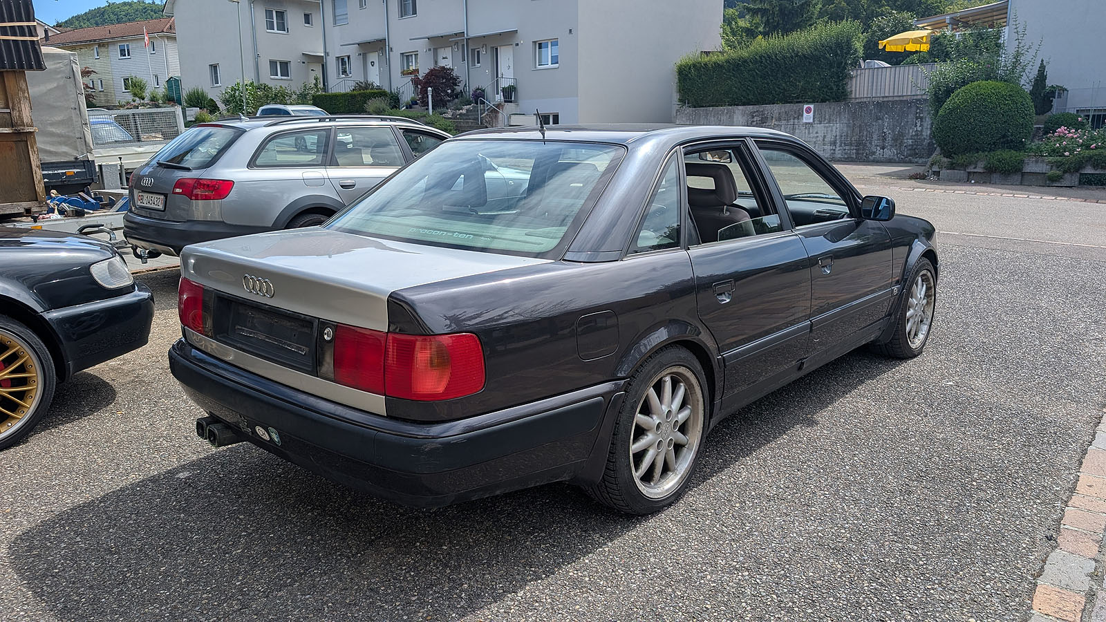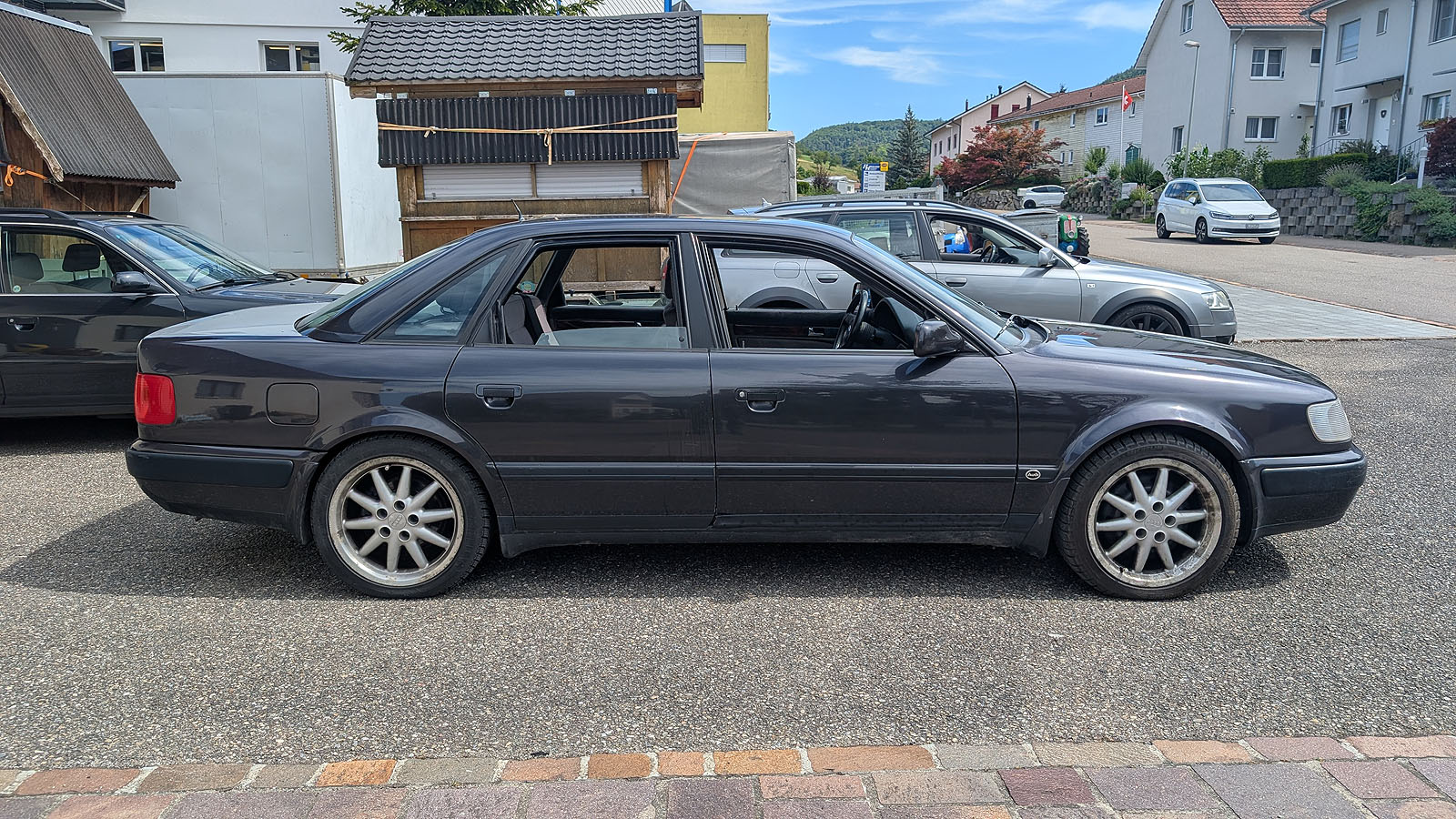 Audi S4 C4 AAN 20V Turbo Handschalter, Jg. 1992 mit UFO Bremse, Jaquard Satin Sitze hell, Wurzelholz Dekorleisten, 3 Speichen Sportlenkrad ohne Airbag. Motor Getriebe einwandfrei, Karosse mit klaren Gebrauchsspuren, Frontscheibe gerissen, Zierleisten rundum alle defekt, hinten links prov. reparierter Unfall auf der Karosse rostig, keine S4 Heckblende, Bremserei hinten und Fahrwerk defekt, Achsteile rostig. Stossstangen Gebrauchsspuren aber gut, Scheinwerfer gut, Sitze gut ohne Risse/Löcher