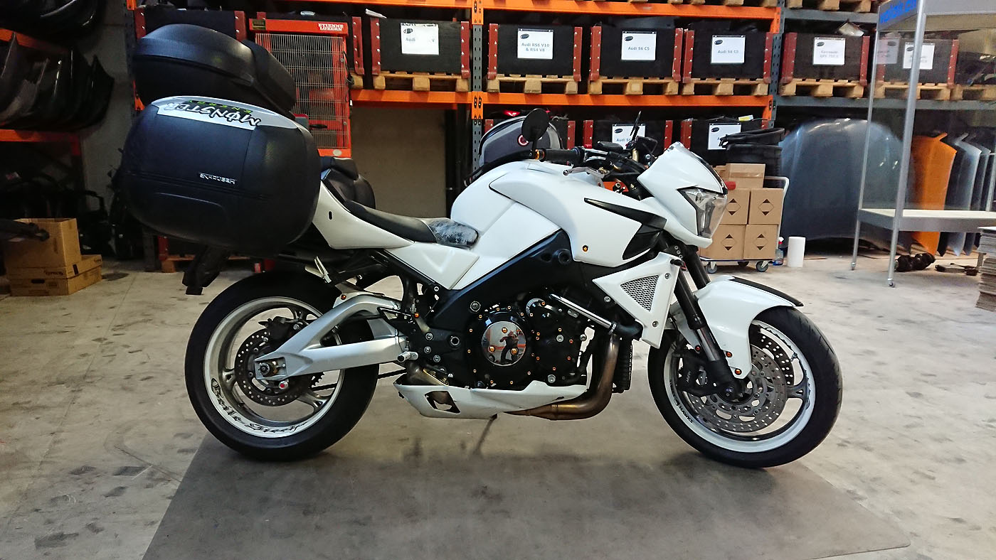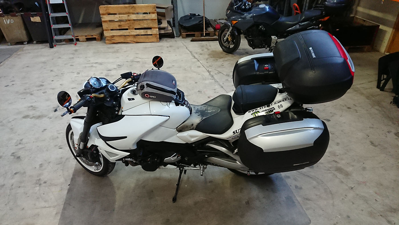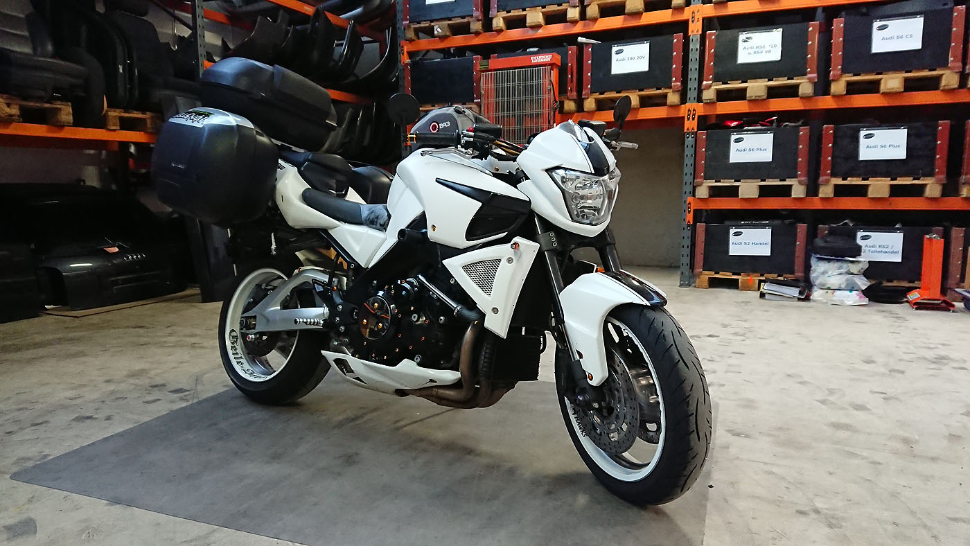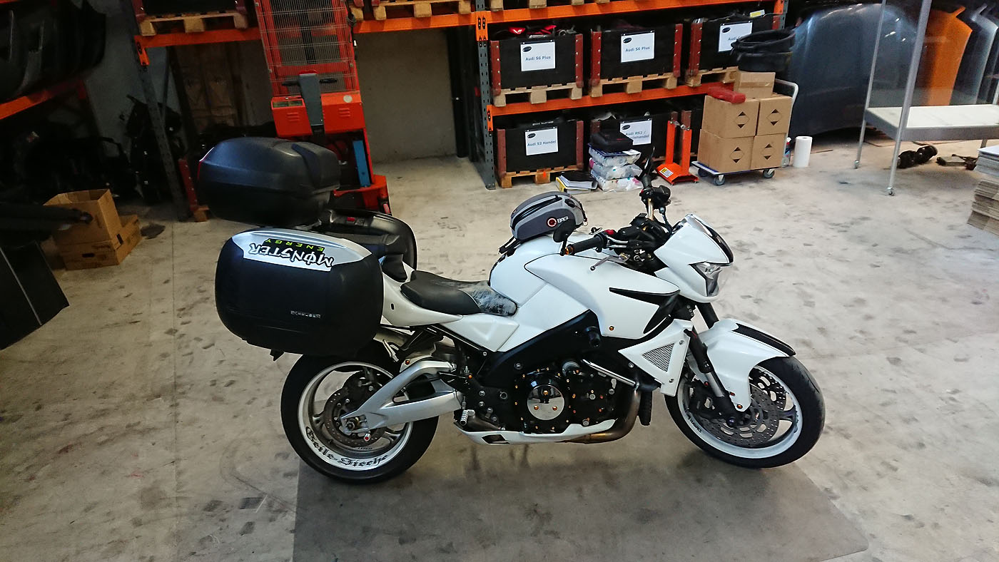Suzuki B-King, Koffersystem Spezialanfertigung, Sport Auspuff, Lenker und Griffe sowie Raster Tuning, Griffheizung, offene Version, Alarmanlage, höhenverstellbares Umlenkstäbe, Kupplung und Bremsscheiben vo ersetzt, Sturzpads